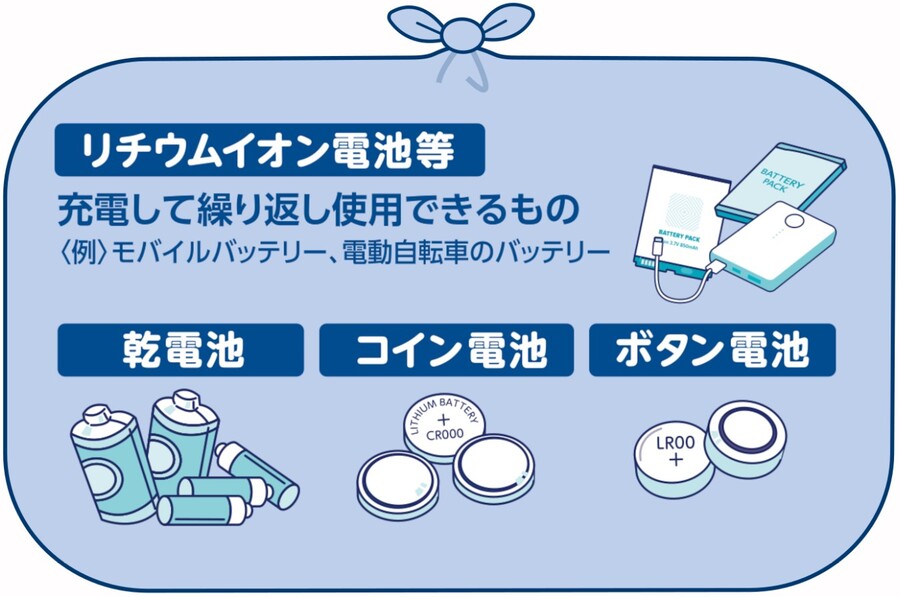 令和7年12月1日から、現在収集している「乾電池」に、モバイルバッテリーなどのリチウムイオン電池やボタン電池を加え、「電池類」として収集が始まります。