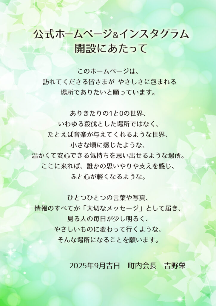お知らせ2025.09.30公式ホームページ&Instagram開設のご挨拶 ポスト シェア はてブ 送る Pocket このたび、町内会の公式ホームページとInstagramを開設いたしました。 私たちの町内会は、防災や清掃、行事や見守り活動など、日々さまざまな取り組みを行っています。けれども、「どんな活動をしているのかわかりにくい」「情報が届きにくい」という声をいただくこともありました。 そこで、地域の皆さまに安心とつながりをより感じていただけるよう、情報をわかりやすくお届けする場として、この新しい情報発信の場を設けることにしました。 以下、町内会長からのご挨拶です。